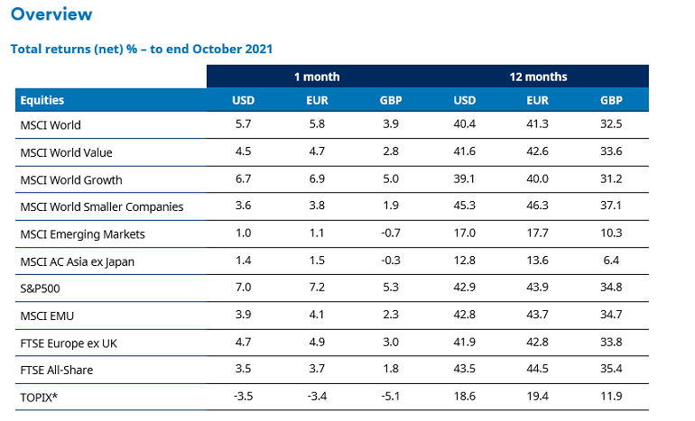 US equities gained in October. Earnings releases were generally strong, with a positive update from Caterpillar – often seen as an economic bellwether – setting a positive tone. There were, however, notable disappointments from Apple and Amazon. Apple cited supply disruption – principally regarding chip availability – as responsible for softer revenues, while Amazon alluded to labour shortages adding to costs.
