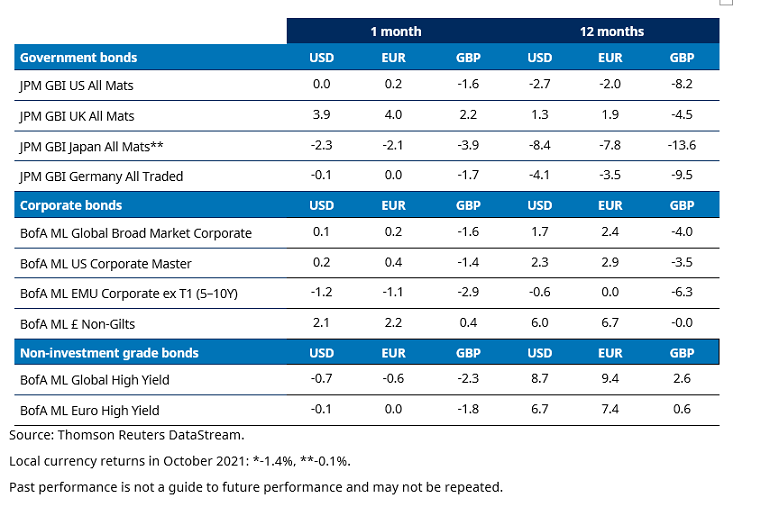 Government bond yields broadly rose as central banks indicated they were prepared to withdraw monetary policy accommodation in light of rising inflationary pressures. Yield curves were generally flatter on the month, with yields at the shorter end of the curves moving markedly higher, but falling in longer dated maturities.