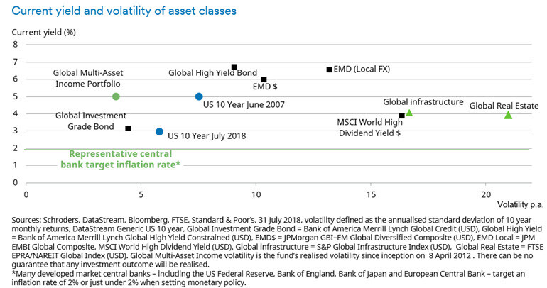 The green dot represents an example of a multi-asset income portfolio. While this may not offer the very highest yield available, diversifying across asset classes and geographies can help to reduce volatility whilst looking to generate an attractive level of income.