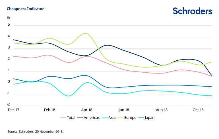 Crucially, the asset class is fairly-priced. The rich valuation levels in the US and in Europe have come down significantly while Japan and Asia ex Japan continue to offer discounts to fair value.