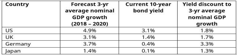 Before the financial crisis, a country’s 10-year yield traded roughly in sync with its trend rate of nominal GDP growth. This relationship broke down with the advent of quantitative easing (QE). The table below, with data courtesy of the OECD, presents where we are today: