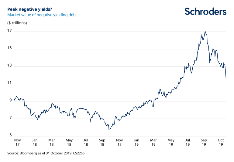 We expect demand for global credit to remain strong. While off recent peaks, the market value of negative yielding debt is still at historic levels (see chart below). We think this will push investors to take more risk as they reach for yield compounded by lower rates and central bank balance sheet expansion. This will likely push investors into higher yielding areas, such as US dollar IG and HY.