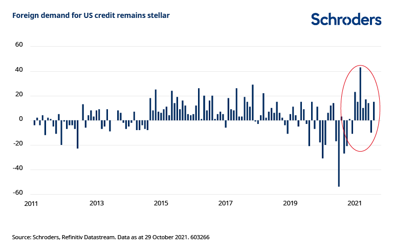“Even with the Fed’s withdrawal of support, monetary conditions will stay accommodative and liquidity withdrawal is not a material risk to credit unless it causes growth to falter. US economic fundamentals are decidedly healthy, notably consumption and end-demand, with household savings at good levels. This is a helpful backdrop for credit. Against this, momentum is slowing and valuations reflect almost no potential negative news.”