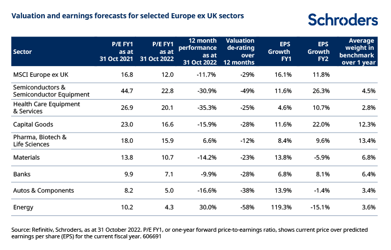 In terms of sectors, energy was the top positive performer in the MSCI Europe ex UK index in 2022 with a 27.9% gain (year-to-date as of 31 October 2022). The sector is unlikely to outperform the index to such an extent in 2023.