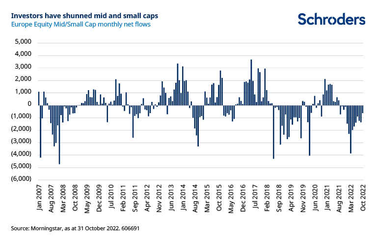Even a moderately better year for Europe could catch out many in the market. Positioning has been very negative with investors deserting higher risk areas, including small and mid-sized companies (see chart below). Any better performance could see this change swiftly.