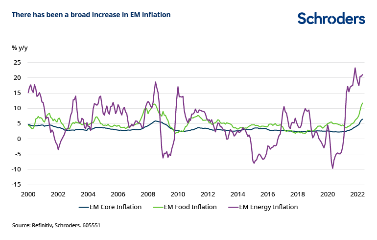 Inflation in emerging markets (EM) appears to have climbed further in June. Concerns that we’ve not yet seen “peak inflation” may add to pressure on EM assets. This is at a time when EM are already under pressure as investors increasingly price in a global recession.