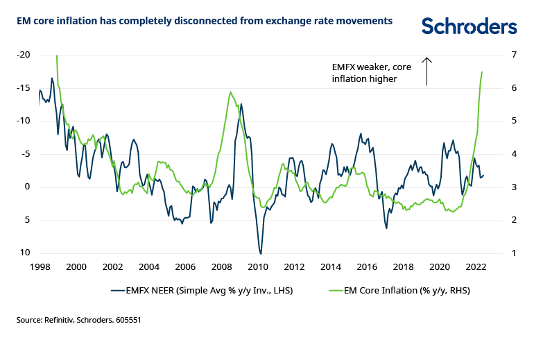 However, EM core inflation has overshot many indicators of price pressures. For example, core inflation is much higher than the rate implied by producer prices, which themselves have risen further than companies’ output prices. And the relationship between underlying inflation and exchange rate movements has completely broken down.
