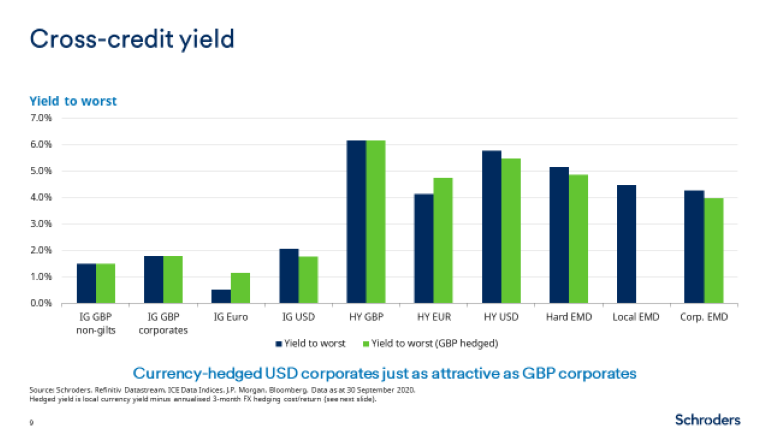 Note that the chart below is from the perspective of a GBP investor and that equivalent versions for USD and EUR based investors can be found within their respective versions of the Schroders Credit Lens