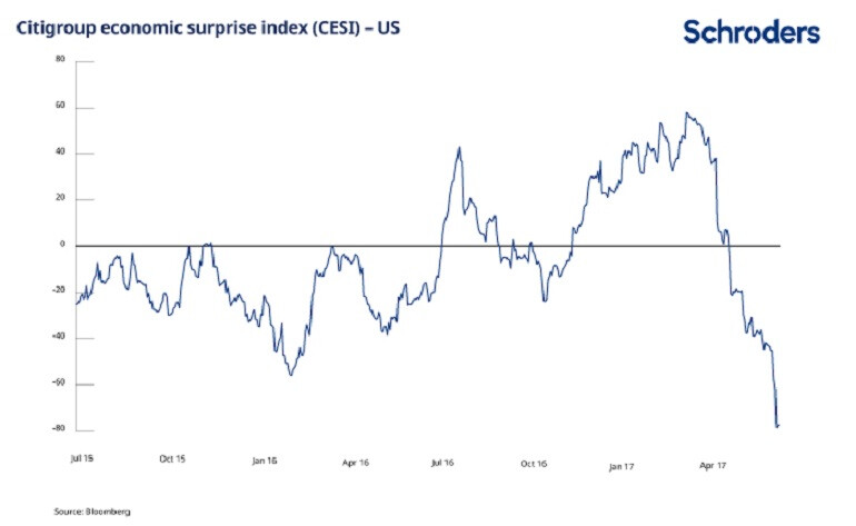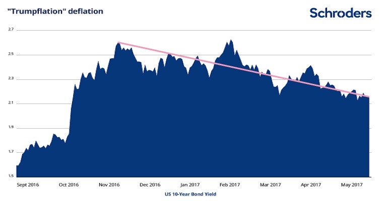 The so-called “reflation rally”, as illustrated by the yield on US 10-year Treasuries in the chart below, started when Donald Trump won the US presidential election. It was based on optimism surrounding his pledges on deregulation, cutting taxes and increasing infrastructure spending. As investors’ hopes about Trump’s policies have faded, so too has the surge in bond yields.