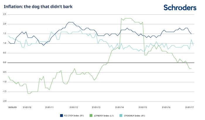 Headline inflation itself is rolling-off as commodities prices slide. In terms of the softness in the core reading, the continued weakness of wage growth in the face of lower unemployment has been a particular surprise. A swift withdrawal of monetary stimulus, rising rates and balance sheet normalisation in the US and tapering of bond purchases in Europe, look all but out of the question. The main hope for a resumption of upwards inflationary pressures at this stage looks to be a fiscal policy announcement from the Trump administration in the US.