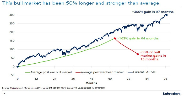 Investors feeling complacent about the current bull market in equities may feel rather less so after seeing the slightly scary chart below. Our multi-manager team has overlaid the performance of the S&P 500 index onto research from Majedie Asset Management, which shows the average post-war bull and bear markets. It illustrates that the current bull run has been unusually long. If and when it grinds to a halt investors might be in for a shock judging by the severity of previous subsequent bear markets.