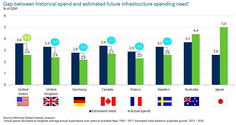 A number of President Trump’s ideas for boosting the US economy have raised eyebrows. Markets were initially cheered by Trump’s targets on unemployment, growth and tax cuts. But critics have also noted the highly ambitious nature of these plans. Already, Trump has met with resistance in implementing tax cuts and healthcare reform. However, for Trump’s goal of a huge boost to infrastructure spending, the numbers at least look more on his side. The chart below suggests that infrastructure spending in most developed economies is below the level it needs to be to meet with future growth. Indeed, the deficit in US is among the highest of the countries reviewed.