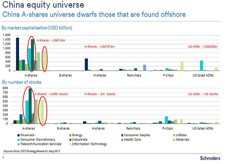 In late June, index operator MSCI announced its long-awaited decision to include Chinese A-shares – onshore Chinese equities traded in renminbi – in its benchmark indices. Expectations are for around $10-15 billion to flow into A-shares from passive and active funds benchmarked against MSCI indices. After three previous rejections, this year’s inclusion is a symbolic step that confirms China’s gradual market liberalisation. It also highlights to investors the sheer size, and potential, of the domestic stockmarket in China, as illustrated in the chart below.