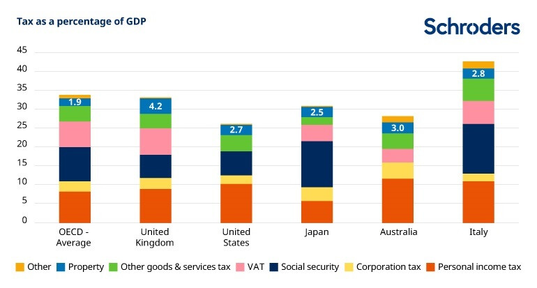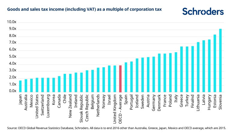 Source: OECD Global Revenue Statistics Database, Schroders. All data is to end 2016 other than Australia, Japan and OECD average, which are 2015.