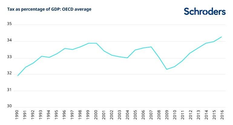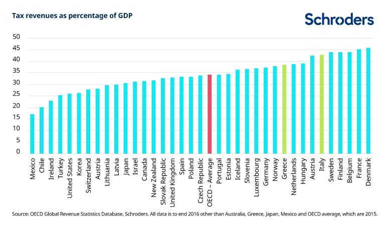 Source: OECD Global Revenue Statistics Database, Schroders. All data is to end 2016 other than Australia, Greece, Japan, Mexico and OECD average, which are 2015.