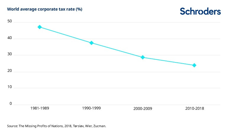 One high-profile story has been the “rates war” on corporation tax. Countries have battled to offer the lowest rates in an attempt to attract companies. To help show that, we’ve pulled in a chart from a recent academic paper. It shows how the average corporate tax rate has experienced a savage decline over an extended period of time. It’s also worth noting that higher pre-tax profits have increased overall corporation tax revenues despite lower tax rates.