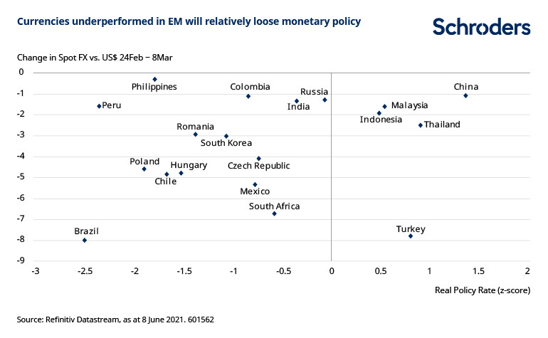 There was a lot going on during that period and for example Brazilian markets also had to contend with high and accelerating new numbers of Covid-19 infections that also appeared to weigh on the performance of assets. However, it does seem that there was some underperformance of markets that had historically low real interest rates when the sell-off in US Treasuries began to hit sentiment towards EM.