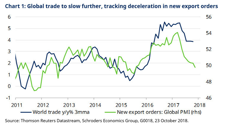 The outlook for global trade looks challenging as forward-looking indicators, such as the global purchasing managers’ index (PMI) of export orders, point to a further deceleration in the coming months. New export orders are an indicator of future trade activity. It therefore seems unlikely that a resurgence in global trade will be responsible for any re-convergence in global growth.