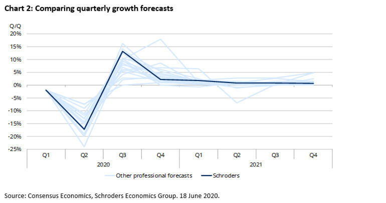 Apart from one organisation, the remaining forecasters agree that the level of GDP will not rebound back to its previous level by the end of 2021. Our forecast is slightly below the consensus for 2021 GDP growth.