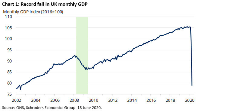 The latest monthly estimate shows that the UK economy shrank 20.4% in April – the first full month of lockdown. This followed a 5.8% fall in March (full UK lockdown came into force on 23 March). This means that economic activity has fallen by 25.1% since its peak in January 2020.