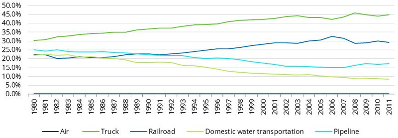 If we look at long term trends for share of total freight transportation in the US (as a proxy because of the quality of data), trucking’s share of ton-miles rose from 30% in 1980 to 45% in 2003, and rail rose from 25% to 30% in the same period. Share gains for both have came at the expense of water and pipelines. Since 2003, shares have been more stable, with the long-term decline of pipelines seeming to have stabilised.