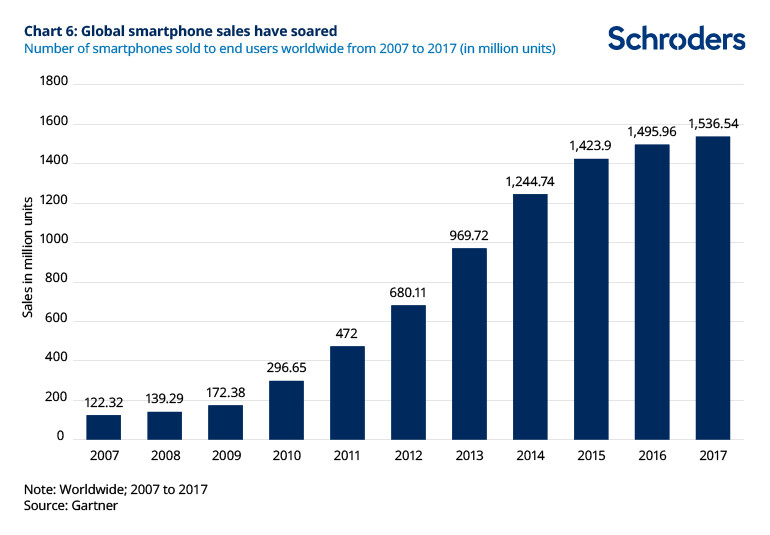 Technology has been the main catalyst for change in the consumer sector, rather than lessons learned during the previous crisis. Since Apple launched the first iPhone in 2007, 67% of the Western European population now carries a smartphone (source: Statista). The growth has been exponential over the last ten years, as shown in chart 6, and this marks a step-change in online penetration.