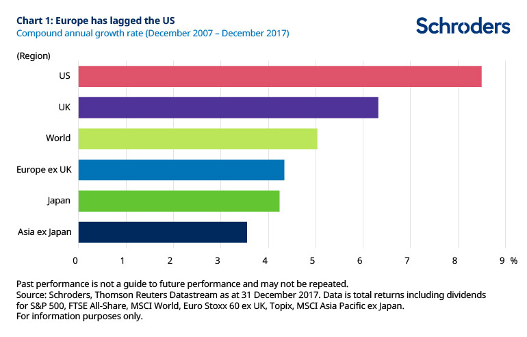 Despite the recent bout of volatility, European equity markets have delivered excellent returns since the depths of the crisis back in 2008/9. As at 31 March 2018, the MSCI Europe index had returned 75% since 15 September 2008, the day Lehman Brothers filed for bankruptcy protection, and 170% since the end of February 2009, the low point of the crisis for European equities (source: DataStream).