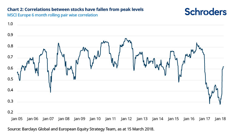 Over the last decade we have experienced regular sustained periods of high correlations between stocks within the market. In 2017 those correlations declined significantly back towards pre-crisis levels before rising again more recently.