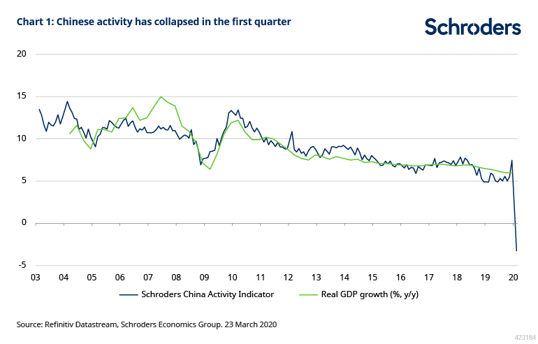 Combining these figures with the trade data (also bad) we can update our in house Chinese economic growth tracker, the Schroders China Activity Index (SCAI). Previously running at a very robust 7% at the end of 2019 as activity accelerated, this has now collapsed to a contraction of over 3% y/y (chart 1).