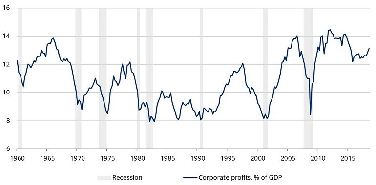 One of the key features of the most recent economic expansion has been the elevated level of profit margins enjoyed by companies. For the US market, this is indicated by the high profit share as a percentage of GDP, shown in the chart below.