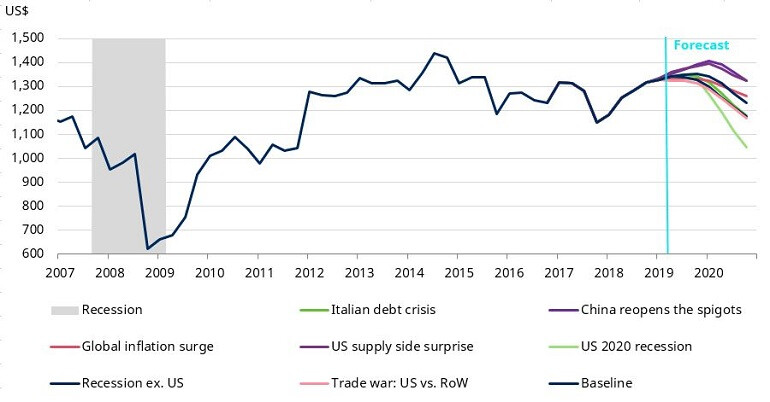 While the above reflects our base case, we have also modelled a number of alternative scenarios. Unsurprisingly, the share of profits would see a sharper decline should a US recession occur in 2020. In that scenario, profits could fall by 13.5% (see light green line on chart below). When modelling a scenario of a global recession excluding the US, the fall in profits came in at 7.4% in 2020 (dark blue line).