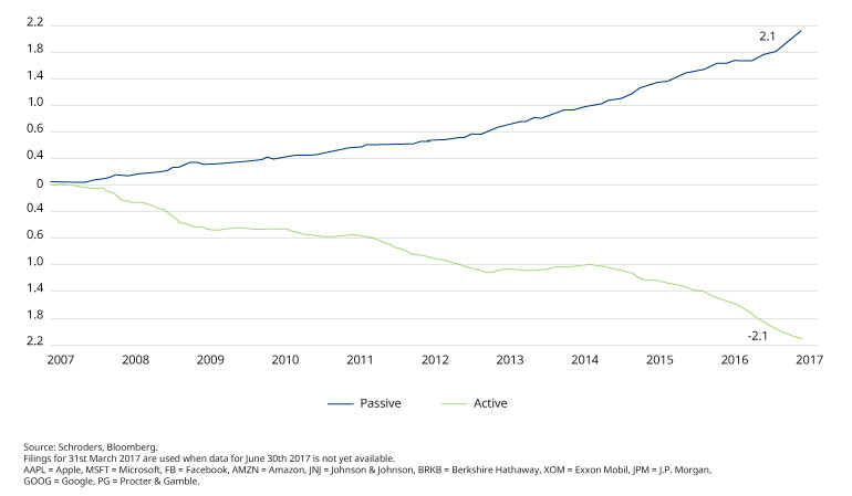 Since 2007, cumulative flows into passive equity vehicles (which ignores segregated institutional accounts) have been US$2.1 trillion. This has been offset by outflows from active vehicles of US$2.1 trillion. Passive exposure of the total market is already estimated to be circa 40% globally, and predicted to rise to as much as 60% over the next 5 years1. These numbers would be higher if we accounted for “quasi” passive flows from non-market cap based index type strategies (including “factor” portfolios).