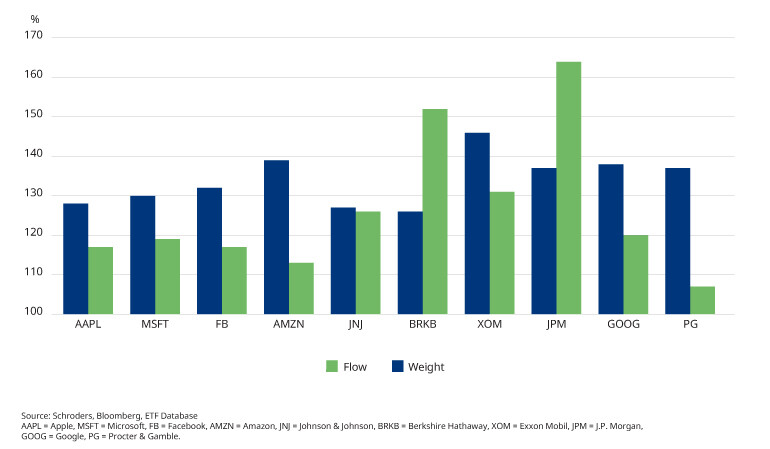 As we can see, every stock in the top 10 S&P 500, has received a significantly greater proportion of passive flow than its market share in the S&P500 would suggest in the last 12 months and their aggregate weights in all the ETFs far exceed each stock’s market cap weight in the broad market index. E.g. the average dollar weighted value of Amazon in all ETFs adds up to 140% of its market cap weight – implying that the historical flows into these ETFs has been at a rate 40% greater than its market cap would justify. Similarly, in the last 12 months the dollar weighted value of the flows into Amazon has been 20% greater than its market cap would justify.