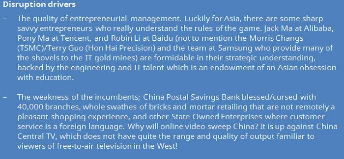 Inevitably the here and now is dominated by China. Once the political will was there, the rest followed given the advantages of scale, economic heft and homogeneity that China uniquely possesses. However, do not underestimate the speed of adoption in other Asian markets, where the basic conditions in terms of average wealth, youthful open-minded populations and weak incumbency co-exist.