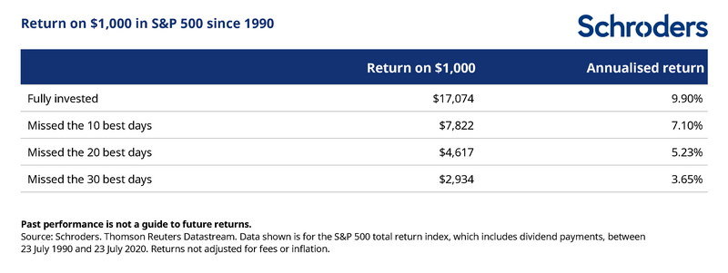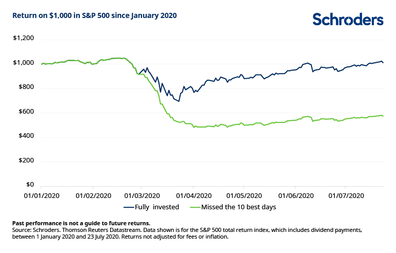 Volatile markets in 2020 have tempted some investors to try to time the markets. But Schroders research shows how difficult and costly this can be.