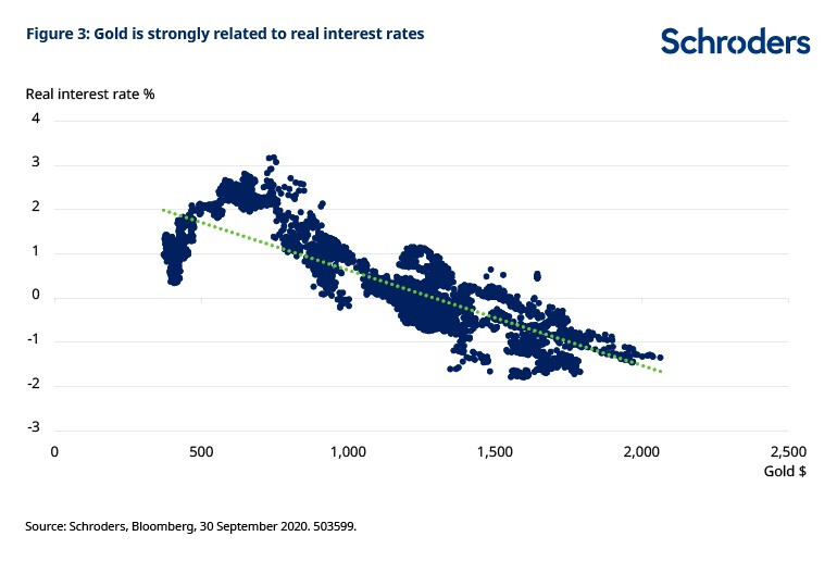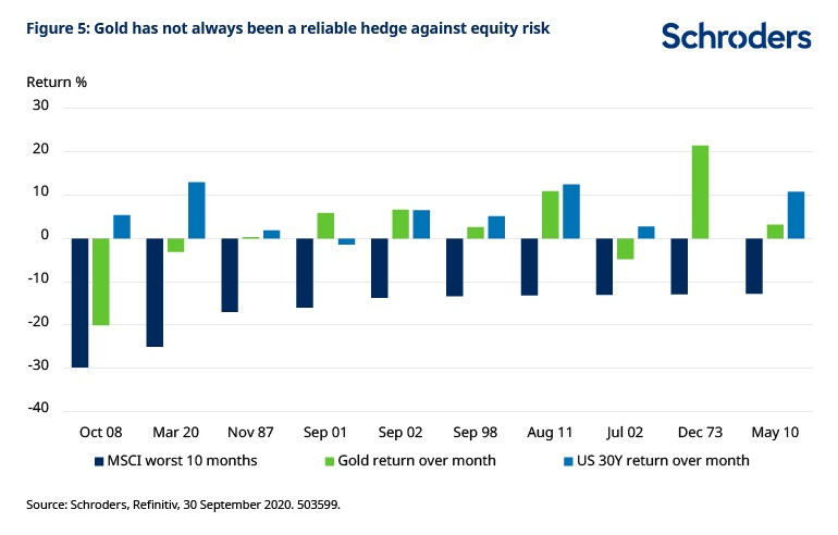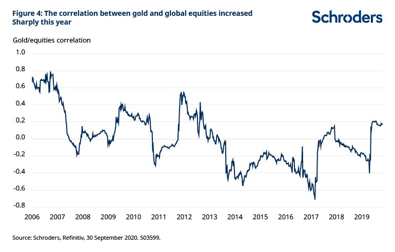 Neither is gold a particularly reliable hedge against equity risk. In some environments, gold actually moves in the same direction as other risky assets such as equities. The environment that prevailed in 2020 is a good example.