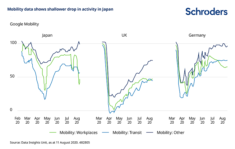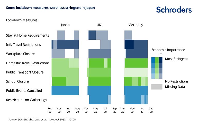 Mark Ainsworth, of the Schroders’ Data Insights Unit, says: “From this, we can see that the UK enacted much stricter stay-at-home requirements than either Japan or Germany. Meanwhile, Japan experienced less stringent workplace and public transport closures.”