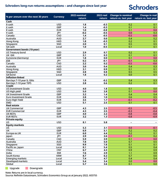 Much has changed in the world since we last compiled our 30-year return forecasts. The healthy presence of upgrades versus last year in the table below (indicated by the green cells) show how these changes have generally been positive for long-term asset returns.