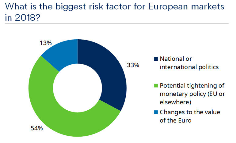 The session started with three questions to the audience. Firstly, what is the biggest risk factor for European markets in 2018? The audience selected “Potential tightening of monetary policy (in the EU or elsewhere)” by a wide margin. Political risks and the euro were much lesser concerns.
