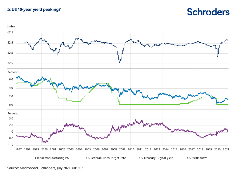 Using the global manufacturing purchasing managers’ index (PMI) as an indicator of economic momentum, we can see that there are many instances in the past 25 years where, when momentum wanes, Treasury yields peak. We can also see that this can occur even if the absolute level of the PMI and global growth remains strong.