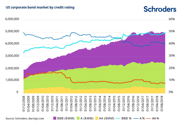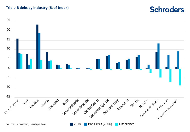 There is no doubt that a major shift has taken place over the decade since the credit crisis, which has seen the triple-B group within the US corporate bond index increase from about 35% to 50% of the index.
