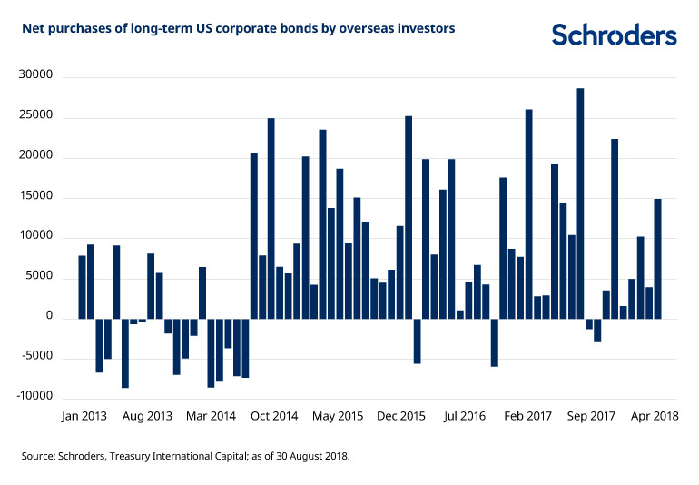 There is also reason to think that the cost of owning fallen angels will be relatively high in the coming downgrade cycle. Firstly, foreign investors, particularly in Asia, have been a strong source of demand in the US corporate bond market (see chart below). As a group, they tend to be sensitive to ratings and would likely be quick to sell any issuers downgraded to high yield, resulting in significant spread and price volatility. Additionally, there has been a large rise in passive IG bond products. These too would become forced sellers as the downgraded bonds would fall out of their eligible universe.