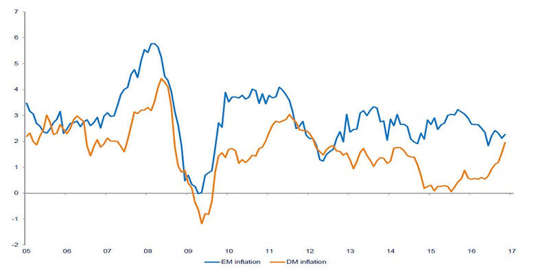 Inflation in EM vs DM, year-on-year 2005-2017