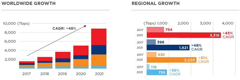 The number of passengers transported by British railways grew roughly fivefold from 5.5 million in 1838 to 30 million seven years later. Equinix expects data flowing through global interconnections to quintuple to 8,200 terabits per second - over just four years – by 2021. This is equivalent to 41 MAREA cables: