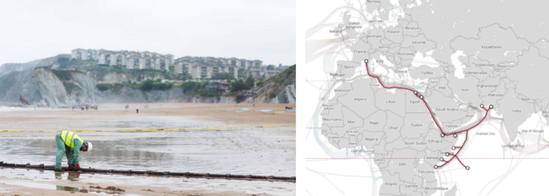 MAREA cable landing at the beach (left), PEACE cable (right)