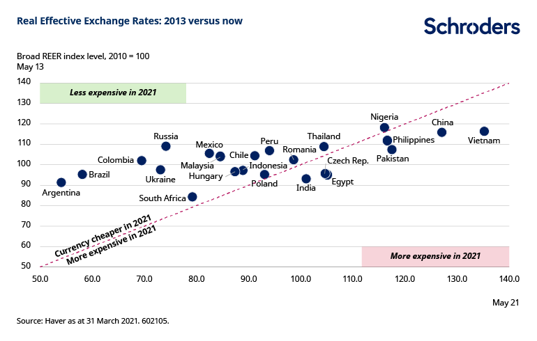 Today, real effective exchange rates are cheaper, external accounts are more solid and inflation is broadly lower, as shown below. Additionally and perhaps most encouragingly, central banks in key countries like Russia, Brazil and Mexico have already hiked interest rates to deal with a rise in inflation. Early signs are that this inflation bump is likely to be short lived given still wide output gaps. If so, this will make EM real interest rates even more attractive. Importantly, foreigners’ share of local debt ownership is now much lower than it was in 2013.