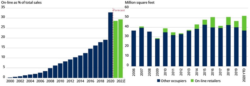 The divergence in performance can largely be explained by the growth in online retail sales. This trend was well established before Covid-19, but the closure of non-essential shops during lockdowns fast-forwarded the shift by approximately five years. Online jumped from 19% of total retail sales in 2019 to around 30% last year. Take-up of big warehouses hit a new record in 2020, as both internet retailers and conventional retailers invested heavily in logistics to fulfil online orders.
