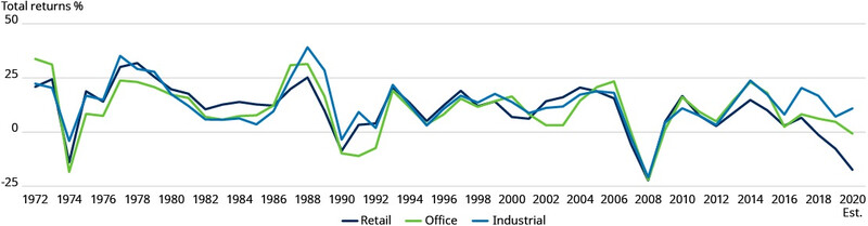 The total returns from the industrial & logistics and retail sectors moved in opposite directions last year. Indeed, 2020 saw the widest range across the three main sectors since the start of MSCI / IPD records in 1970.