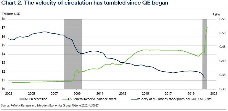 Some argue that this time is different as the money created by QE is being fed directly into the economy through increased fiscal spending. However, whilst it is true that central banks are creating money and buying government bonds almost as rapidly as public debt is rising, this is not the same as printing money and spending it directly in the economy.