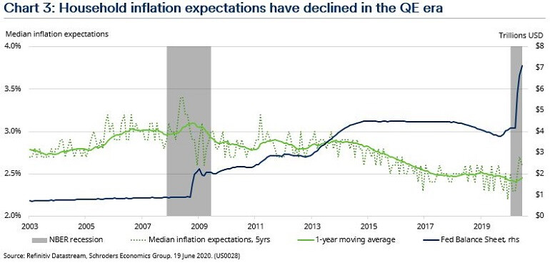The important point is that the act of QE does not induce households and companies to go out and spend more. Those decisions largely depend on confidence in the future which in turn is driven by the strength of incomes and balance sheets alongside innovation and technology. From an inflation perspective, QE has had little impact on household price expectations which have continued to decline throughout the QE era – a key factor in containing wage growth (chart 3).